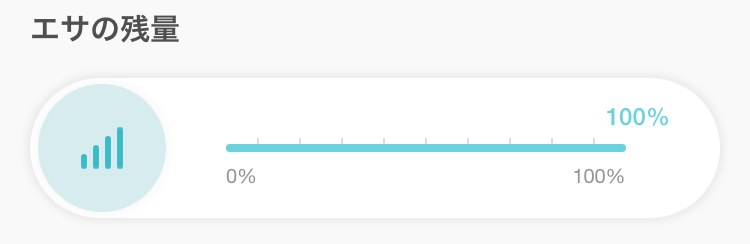 給餌コンテナ内のエサの残量(目安)を表示します。エサの量が30%以下になった時と0%になった時に、登録したアドレスにお知らせメールが届きます。
