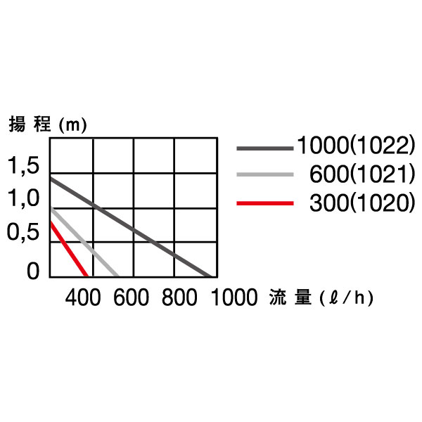 ポンプ性能とは、モーター部分を単独運転させたときの理論上の最大流量を示します。使用環境により実際の流量とは異なります。