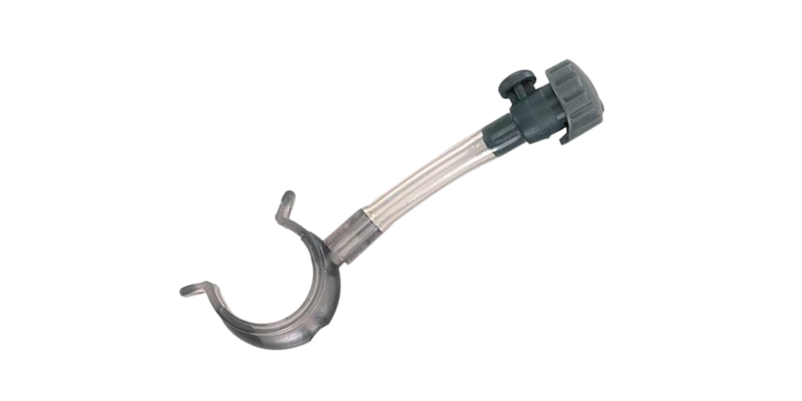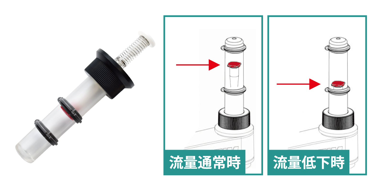 付属のクリップを使用し、あらかじめ流量計測位置をセットします。流量が正常な場合はインジケーター(赤)が上のクリップ位置に近づいた状態です。流量が低下するとインジケーターが下のクリップ位置の近くまで下がります。